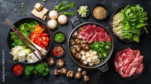 tempting, display, raw, sukiyaki, component, rustic, wooden, surface, delectable, beef, slice, fresh, mushroom, silky, tofu, leafy, greener, ingredient, food photography, exquisite, favor, topview, vibrant, texture