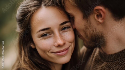 couple, love, romance, affection, human relationships, people, woman, man, face, smile, happiness, beauty, connection, partnership, togetherness, nature, outdoors, green, blur, background, natural, tender, warm, caring, romantic, serene, peaceful, joyful, closeup, portrait, soft, light, brown, earthy, detail, texture, candid, lifestyle, emotion, feeling, moment, expression, hugs, hug, young, adult, loving, bond