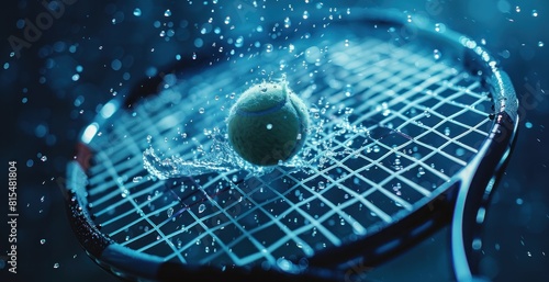 A tennis ball is on a tennis racket that is wet