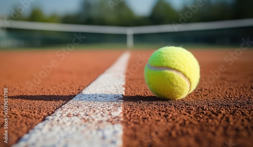 tennis, ball, sitting, court, yellow, middle, sport, competitive, leisure, game, match, play, line, equipment, lifestyle, net, recreation, active, background, exercise, fitness, green, closeup, tournament, white, summer, racket, athletic, object, set, health, clay, red, training, hobby, tennis ball, close, professional, individual, healthy, racquet, orange, sphere, horizontal, shadow, player, concept, tennis court