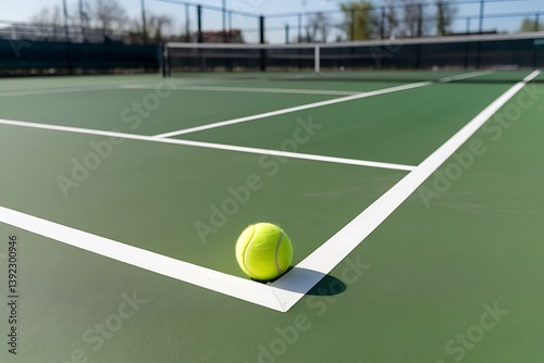 tennis, ball, court, green, yellow, line, baseline, sideline, net, fence, sport, game, equipment, recreation, activity, exercise, fitness, competition, match, player, serve, volley, smash, ace, double, single, sunshine, sunny, day, summer, spring, asphalt, surface, athletic, healthy, lifestyle, tournament, championship, professional, amateur, training, practice, vibrant, bright, white, shadow, perspective
