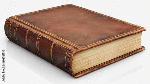 A thick, aged book with a brown leather cover, gold-toned edges, and visible, slightly yellowed pages rests on a white background, casting a subtle reflection