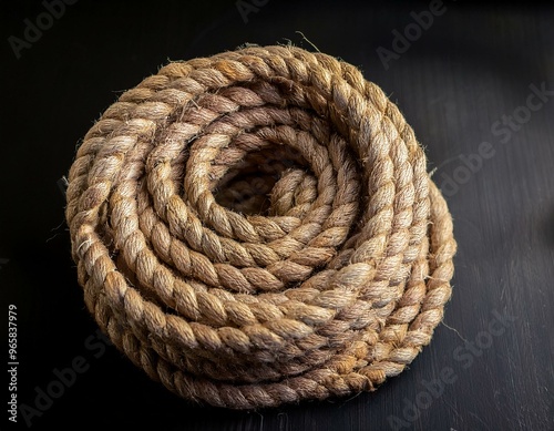 A thick, coiled rope with frayed edges lies on a black background. The rope is made of natural fibers and has a rustic appearance.