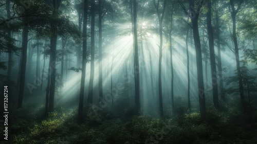 fog, forest, sunbeam, tree, mist, nature, serenity, landscape, calmness, light, greenery, atmosphere, wilderness, exploration, sunlight, shadow, outdoors, calm, canopy, beauty, peaceful, environment, foliage, filtering, natural, path, listening, breathing, science, wildlife, adventure, hiking, scenery, floor, wood, calmness, untouched