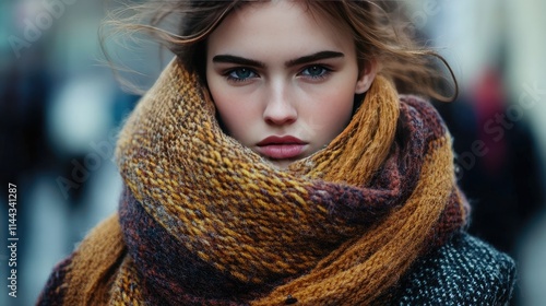 A thick scarf wrapped tightly around a model's neck, paired with a wool coat and boots