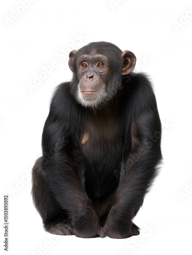 chimpanzee, primate, ape, animal, wildlife, mammal, isolated, white background, portrait, sitting, black, furry, creature, wild, nature, looking, cute, monkey, zoo, studio shot, captivity, thoughtful, expression, curious, face, front view, hairy, fauna, studio, background, upright, arm, gazing, calm, dignity, expressive, gentle, old, ageing, senior, serene, peaceful, zen