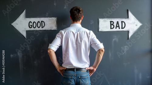 A thoughtful man stands between two arrows labeled "Good" and "Bad," contemplating his choices. This image is ideal for decision-making content, motivational articles, or personal development resource