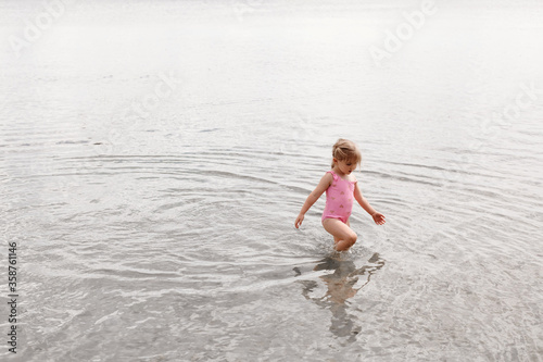 A three-year-old girl of European appearance plays in the water on the beach. A child walks ankle-deep in the lake. Holidays in nature. Summer photo of a baby in a swimsuit.