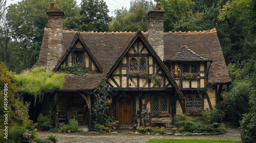 A timber-framed medieval house in England with a slanted roof, small leaded windows, and a rustic atmosphere.