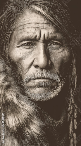 portrait, elder, man, fur, collar, long hair, grey hair, wisdom, resilience, sepia tone, old age, ethnic, native, traditional, weathered, strength, determination, monochrome, closeup, face, wrinkle, beard, moustache, head shot, studio shot, detailed, expression, culture, heritage, human, male, adult, serious, formally, dignified, character, ageing, one person, eye, nose, mouth, amerindian, ancestor, black-and-white, indigenous