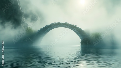 A timeless stone arch bridge spans across a calm body of water, with dense mist surrounding the scene. The soft glow of light through the mist adds an element of mystery and serenity, ideal for