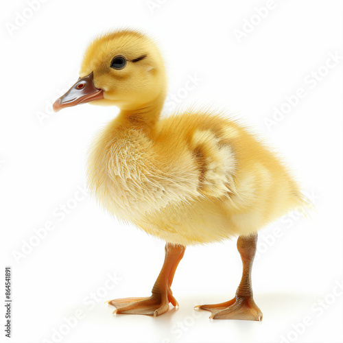 A tiny baby duckling with fluffy yellow feathers, standing on its webbed feet, isolated on white background