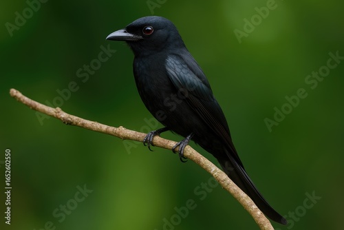 A tiny black passerine bird from the Dicruridae family, frequently seen in tropical southern Asia, spanning from southwest Iran to India.
