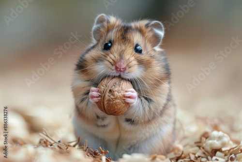 A tiny hamster holding a walnut in its paws, sitting on a soft bed of wood shavings. The hamster's cheeks are puffed up with food