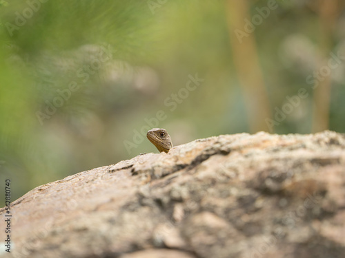 lizzard, animal, reptile, wildlife, australian, australia, scared, spooked, look out, frightened, hiding, no one, nobody, no people, outdoors, colourful, bright, green, dragon, eye, creature, reptile, animal, tail, scale, pet, closeup, copy space, fauna, zoo, striped, stripes, rock, botanic, garden