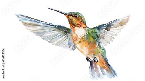 A tiny watercolor of a hummingbird in flight, embodying grace and speed, isolated with a white background