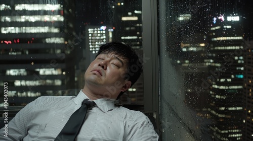 sleepy, businessman, resting, window, rainy, city landscape, night, solitude, light, urban, stress, break, work, exhaustion, skyline, quiet, moment, landscape, emotion, office, introspection, fatigue, peaceful, scene, silence, comfort, calmness, tied-up, metropolitan, atmosphere, character, deep, thought, loneliness, life, environment, people, nature, architecture, contemplation, view, relaxation, calm, daydream