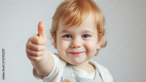A toddler giving a thumbs up on white background. Isolated on white background.