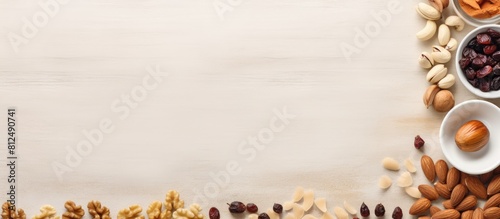 A top down copy space image of a beige table with an almond frame showcasing healthy food