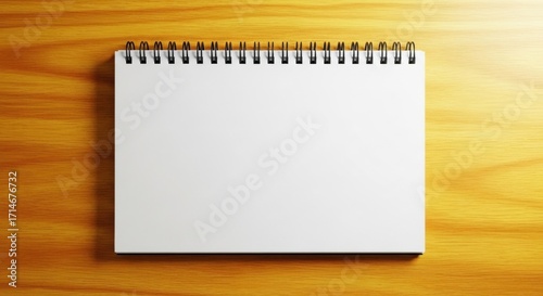 A top down view of a blank spiral notebook on a wooden surface with warm lighting and soft shadows