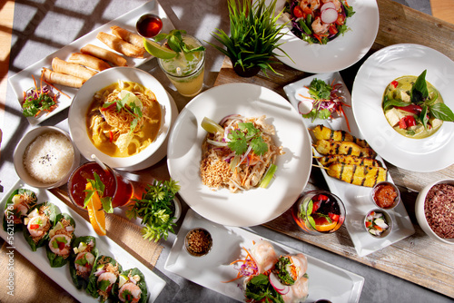 A top down view of a variety of Thai entrees on a dinner table, featuring pad Thai, Panang curry, chicken satay, green curry, and shrimp Miang Kham.