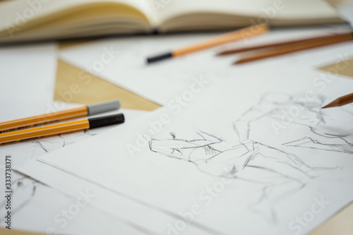 A top view flat lay of many figure drawing pencil and marker sketches. The artist worskspace with male and female drawings and pencils on the white paper, art, craft, creativity, inspiration, concepts