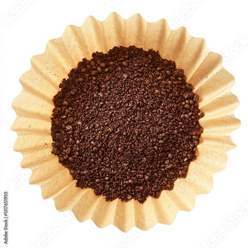 A top view of a coffee filter with a small pile of ground coffee inside, isolated on a white background