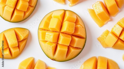 A top-down view of freshly sliced Thai mangoes on a bright white backdrop, perfect for healthy eating and tropical fruit branding