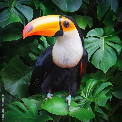 toucan, bird, beak, jungle, rainforest, tropical, leaf, green, wildlife, nature, animal, exotic, vibrant, colourful, feather, forest, amazon, plumage, fauna, flora, birdlife, avian, creature, wing, eye, head, perched, sitting, closeup, detail, bright, beauty, wild, photograph, image, picture, photo, photo, stock, illustration