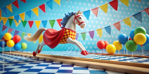 A toy horse with a red cape is speeding down a vibrant track with blue and yellow stripes