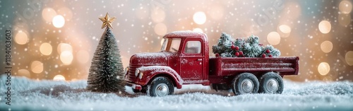 A toy red truck carrying a Christmas tree, surrounded by snowy decor and festive lights. Perfect for holiday, winter, and nostalgic themes.