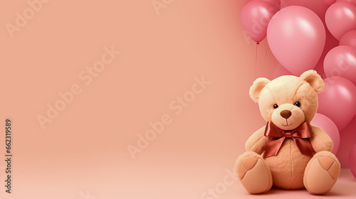 A toy teddy bear and balloons on a pink background. The concept of birthday greetings, for girls. Girly style. Copy space.