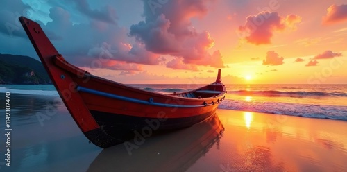 A traditional Balinese proa boat half-buried in the sand with the vibrant colors of sunset reflected in its hull, coastal scenery, warm light