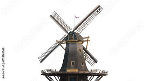A traditional Dutch windmill with large sails and a national flag at its peak, isolated against a simple transparent background. background removed