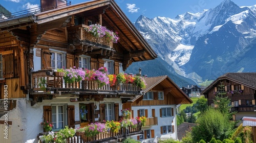 A traditional Swiss chalet with wooden balconies and flower-filled window boxes, nestled in a picturesque alpine village surrounded by snow-capped peaks.