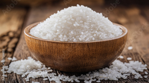 A traditional wooden bowl filled with white rice, with a few grains scattered on the table, adding a natural and rustic feel. --chaos