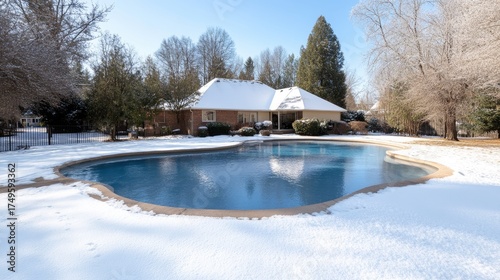 A tranquil backyard reveals a swimming pool blanketed in snow, surrounded by frosty trees and a luxurious home, capturing the essence of a cold winter day