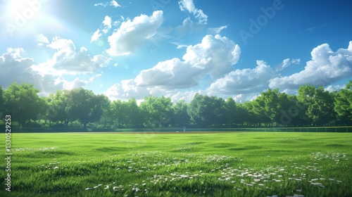 A tranquil baseball field featuring green grass, bases, and a pitcher's mound. Surrounded by dense trees under a blue sky with scattered clouds, it exudes calmness and charm.