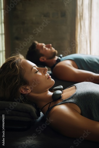 spa, massage, couple, relaxation, wellness, therapy, hot stone, treatment, health, stone, well-being, serene, peaceful, calm, lying down, body, care, beauty, calmness, closeup, profile, face, eyes closed, neck, shoulder, arm, grey, tank top, skin, hair, man, woman, young, adult, indoor, daylight, natural, lifestyle, alternative, meditation, healing, balance, soothing, zen, luxury, human relationships
