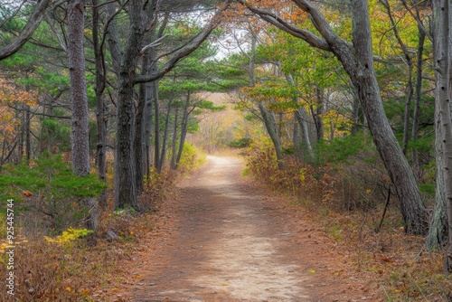 A tranquil forest path surrounded by autumn foliage, with sunlight illuminating the trail ahead.