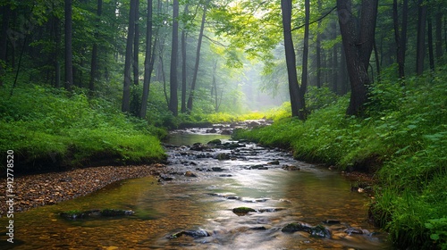 A tranquil forest scene with a clear stream flowing through lush green surroundings and vibrant colors Stock Photo with copy space