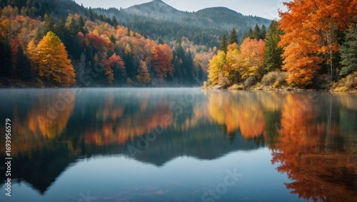 A tranquil lake reflects autumn trees with vibrant orange leaves, surrounded by foggy mountains. Serene fall season scene of still water surface reflecting the dramatic forest park landscape.