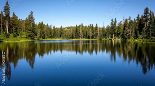 A tranquil lake surrounded by towering pine trees, their reflections mirrored perfectly in the still water under a clear blue sky.