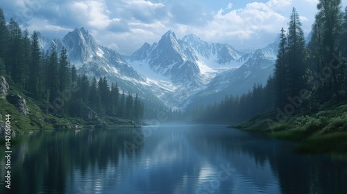 A tranquil mountain lake surrounded by towering peaks and dense forests