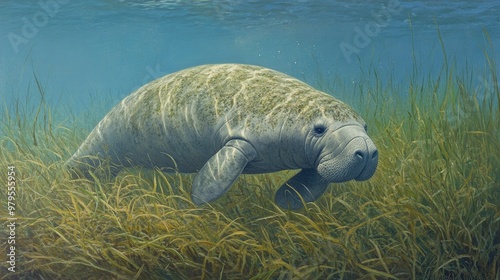 A tranquil scene of a manatee slowly moving through a seagrass bed, with its gentle demeanor reflecting the calm of the underwater world.