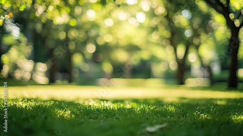 A tranquil scene of lush green grass surrounded by soft bokeh from sunlight filtering through trees.