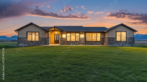 a, tranquil, ranch, home, stone, accent, large, window, illuminated, under, night, sky, green, grass, front, yard, stretches, mountain, far, distance, house, sit, without, any, structure, nearby, surrounded, natural, beauty, landscape, vibrant, sunset, furniture, apartment, comfortable, pillow, indoor, bedchamber, interior, room, window, luxury, cosy, floor, no people
