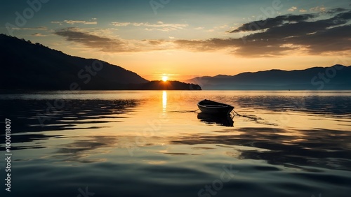 sunset, lake, boat, mountain, water, evening, tranquil, nature, calm, landscape, horizon, cloud, solitude, summer, scenic, peaceful, sky, ripple, travel, exploration, relaxation, environment, colours, boating, adventure, escape, serenity, twilight, picturesque, vacation, beauty, stillness, wildlife, weather, scenery