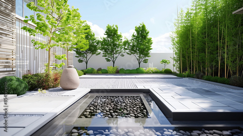 A tranquil urban Modern minimalistic garden featuring lush plants and a wooden deck , mockup 3d render exterior