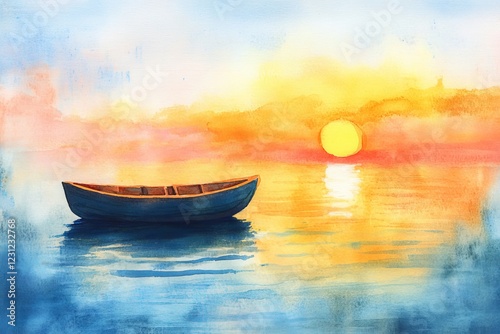 sunrise, boat, watercolor, painting, calm, water, vibrant, serene, tranquil, art, landscape, horizon, sky, sun, morning, peaceful, solitude, nature, artistic, colourful, dawn, scene, illustration, creative, bright, light, ocean, sea, beauty, atmosphere, glow, orange, blue, yellow, composition, visual, harmony, balance, inspiration, imagination